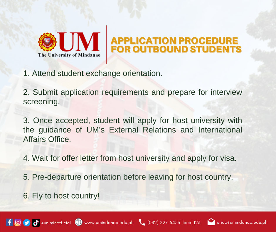 Students may apply by complying all the requirements for the outbound exchange program. Then the student/s will have to undergo screening interview before being officially selected as outbound exchange student/s of the University.